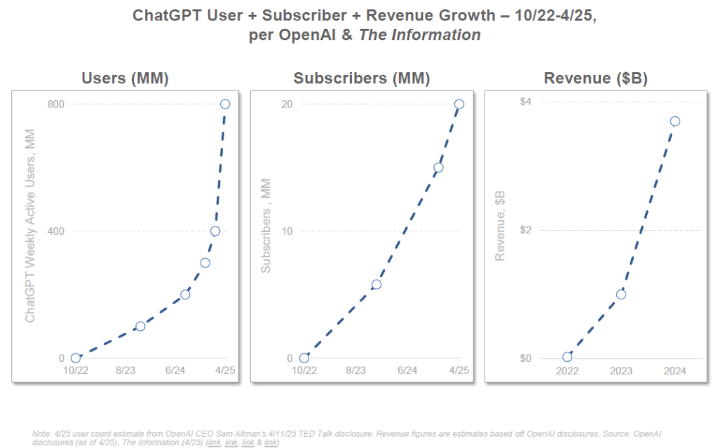 ChatGPT, l’agent conversationnel d’OpenAI, illustre cette dynamique fulgurante. Lancé fin 2022, il a atteint 1 million d’utilisateurs en 5 jours seulement (quand il avait fallu ~10 ans à la Ford Model T pour écouler le million d’unités). Mieux, ChatGPT a franchi le cap des 100 millions d’utilisateurs en à peine 2 mois, pulvérisant le record de TikTok (9 mois) et d’Instagram (30 mois). Au bout de 17 mois, fin avril 2025, ChatGPT revendiquait déjà 800 millions d’utilisateurs – soit environ 10% de la population mondiale – un rythme de croissance qualifié d’« sans précédent dans l’histoire tech ». Pour comparaison, Netflix n’a atteint les 100 millions d’abonnés qu’en une décennie. L’adoption globale est également notable : dès sa troisième année, environ 90% des utilisateurs de ChatGPT étaient en dehors d’Amérique du Nord, là où il avait fallu 23 ans à l’Internet pour se mondialiser autant.