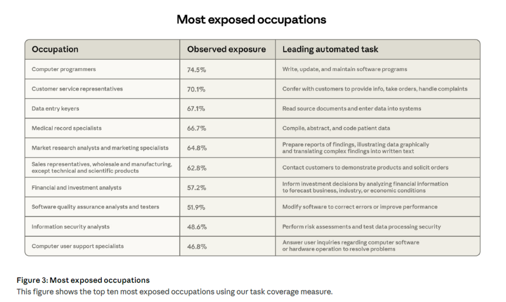 Le rapport identifie les dix métiers les plus exposés selon cette nouvelle mesure. En tête, les programmeurs informatiques affichent un taux de couverture de 74,5 %, leur tâche principale — écrire, mettre à jour et maintenir des programmes, étant massivement observée dans les usages de Claude.
