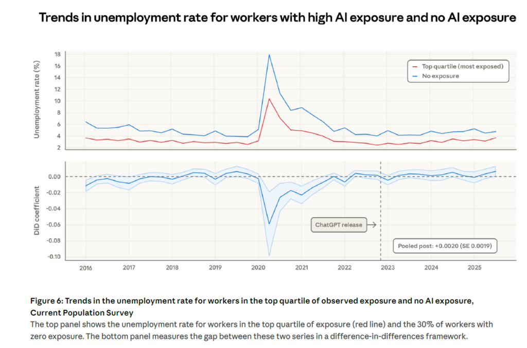 Le résultat le plus rassurant, et pas si surprenant que ça, du rapport est l’absence d’effet mesurable sur le taux de chômage des travailleurs exposés depuis la sortie de ChatGPT fin 2022. L’analyse en différences de différences ne révèle aucune divergence statistiquement significative entre le quartile le plus exposé et le groupe non exposé, avec un coefficient de +0,0020 (écart-type 0,0019), indiscernable de zéro.