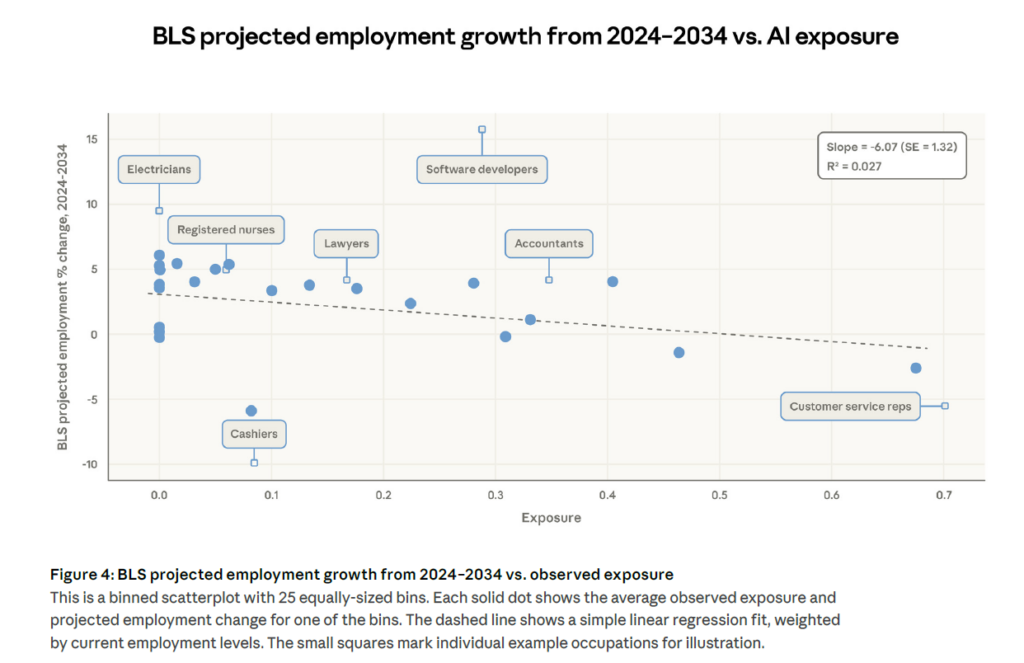Les auteurs montrent une corrélation modeste mais réelle entre leur mesure d’exposition et les projections d’emploi 2024-2034 du Bureau of Labor Statistics : pour chaque augmentation de 10 points de pourcentage de la couverture observée, la projection de croissance de l’emploi diminue de 0,6 point.